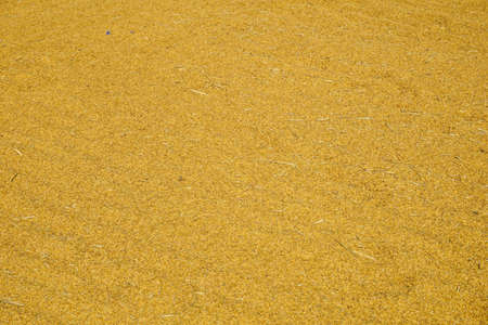 Paddy jasmine rice texture for background and wallpaper in gold color. Thai farmer dry paddy jasmine rice on ground under strong sunlight after harvest and before keep in storeroom