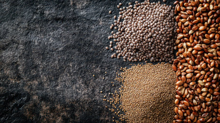 This image showcases a vibrant mix of grains and seeds on a dark green surface, highlighting textures and colors ideal for culinary and nutritional purposes.