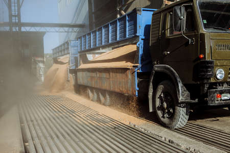 Truck filled with yellow grain drives near new metal modern elevator sunny day