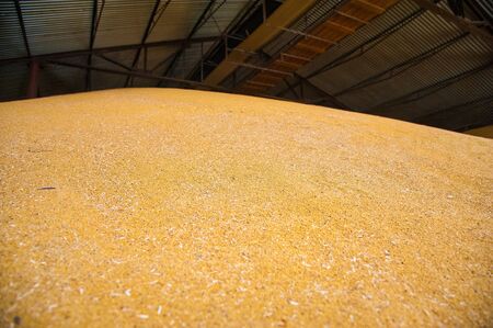 Wheat at bulk cargo warehouse storage for animal feed industry.
