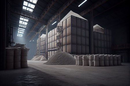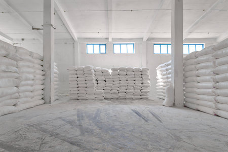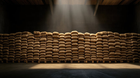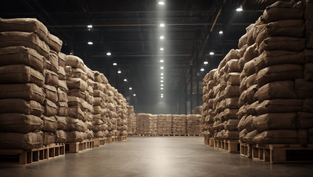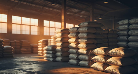 Spacious warehouse with stacked sacks of white rice and grain bags for global logistics and cargo
