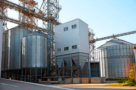 View of modern granaries for storing cereal grains outdoors