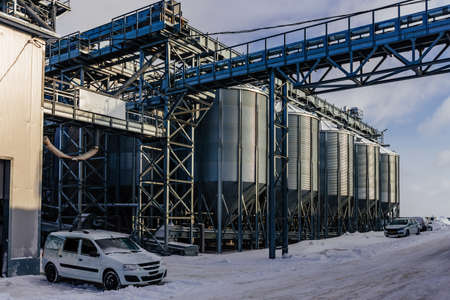 agro silos granary elevator in winter day in snowy field. Silos on agro-processing manufacturing plant for processing drying cleaning and storage of agricultural products, flour, cereals and grain.