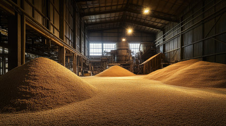 Grain processing facility inside. Industrial factory silos and equipment for food production