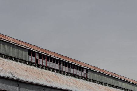 Angled view of industrial rooftop against a gray sky, corrugated metal, copy space, horizontal aspect