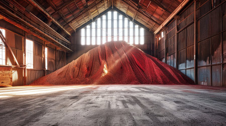 Large heap of potassium fertilizers in plant storehouse