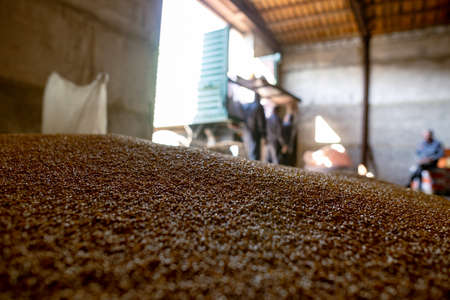 Piles of wheat grains at mill storage or grain elevator. The main commodity group in the food markets.