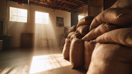Morning light streams into a spacious warehouse, casting beams across a wall of neatly stacked burlap sacks. Dust particles dance in the beams, creating a serene atmosphere.