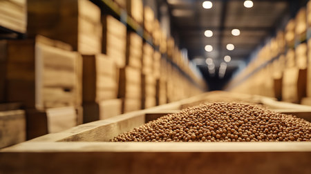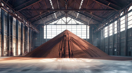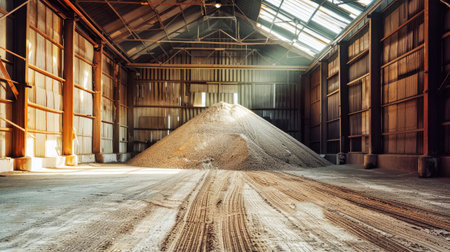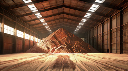 A spacious industrial warehouse filled with heaps of grain, featuring warm lighting and a rustic atmosphere. Ideal for agricultural and storage themes.