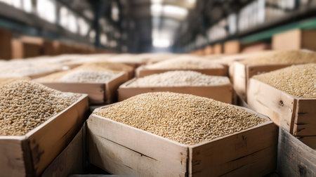 This captivating image showcases a vibrant view of grain storage, focusing on the rich textures and colors of harvested crops in wooden containers under a bright sky.