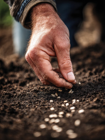 Farmers are skillfully hand planting seeds into dark, fertile soil in a rural field, taking advantage of the spring season for optimal growth.