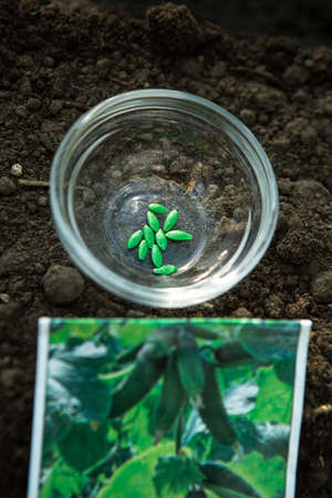Planting cucumber seeds in a greenhouse. Cucumber seeds in the garden next to the package