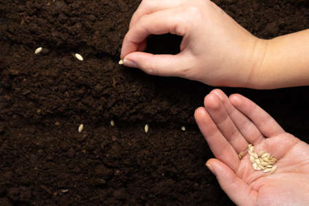 Young peasant woman planting seeds of carrots, radishes and beets in a warm black earth. Warm spring sunny day is good time for planting. Social assistance to farmers. Close-up view hands