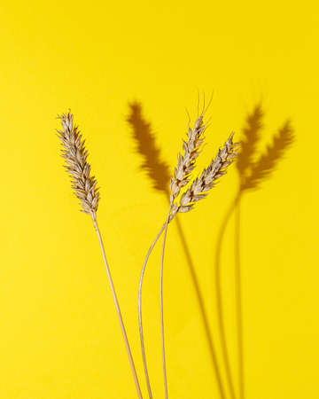 Spiny ears of rye filled with grains on a yellow background. Rye is a typical cereal grain for food.