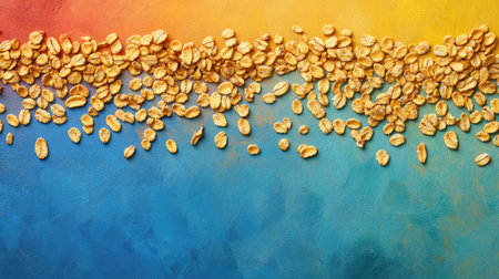 A bright and vibrant gradient background features a spread of raw oats, representing healthy eating and nutrition. Ideal for wellness and food photography.