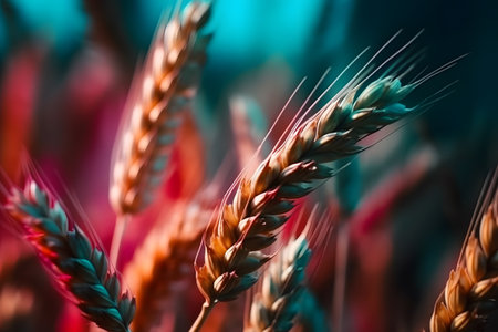 Beautiful close up of wheat ears at sunset. Field of wheat agriculture in summer. Generative Ai.