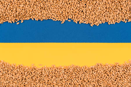 Wheat grain over Ukrainian blue and yellow flag with copy space. Global and European food crisis. World wheat grain crisis after russian invasion of Ukraine