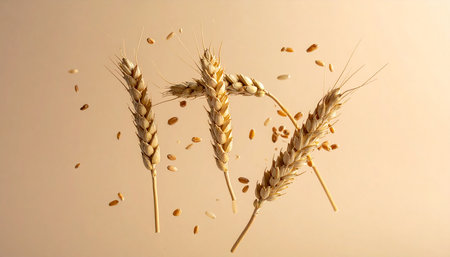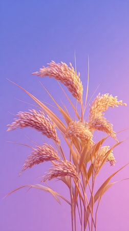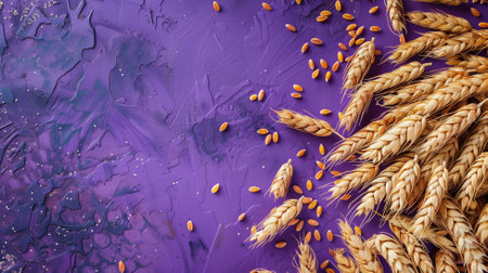 Golden wheat ears and scattered grains on a textured purple background with artistic splatters