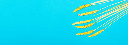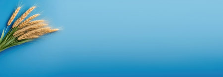 Vaisakhi, Sikh New Year, Shavuot jewish, bouquet of wheat, rye and cereals, ears of wheat, blue background, horizontal banner, place for text