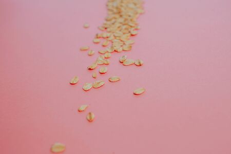 Fun healthy food, the concept. Grain oatmeal on a pink background. Oat flakes scattered, copy space