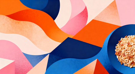 Natural grains cascade from a curved yellow surface, highlighting the contrast between earthy tones and bold colors, creating an appealing visual experience.