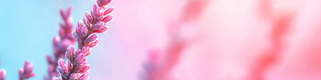 Delicate pink flower buds on a spring blossom branch against a soft pastel gradient background