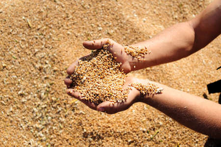 Harvest, close up of farmer's hands holding wheat grains against the background of grain