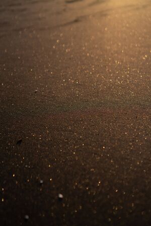 Close up of clean yellow sand surface covering seaside beach illuminated with day light. Travel and vacations concept