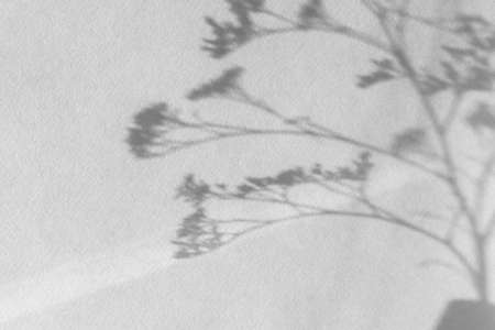 Flower shadow grey wall. Abstract neutral background. Gray shadows of dried field plants on the gray texture of the paper. Minimalistic composition, beautiful modern design. Mocap natural, copy space