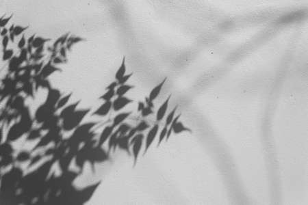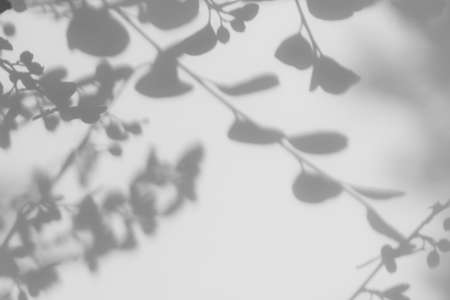 Gray shadow of tree leaves and branches on a white wall. Abstract neutral nature concept blurred background. Space for text. Shadow for natural light effects.