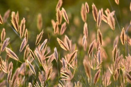 Close-up Beautiful African fountain flower blooming grass field with sunset light on background. Poaceae Grass Flowers, select focus only on some point