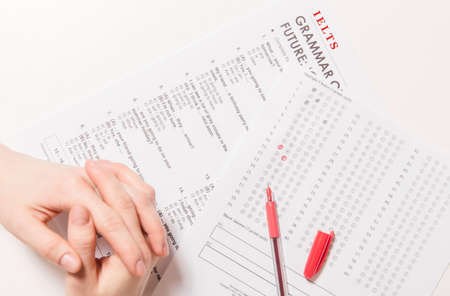 Test of English multiple choice on table. Woman takes an entrance exam.