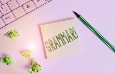 Conceptual hand writing showing Grammar. Concept meaning whole system structure language syntax and morphology Green note paper with pencil on white background and pc keyboard