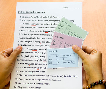 colorful English grammar sheets on white table in front of whiteboard in classroom
