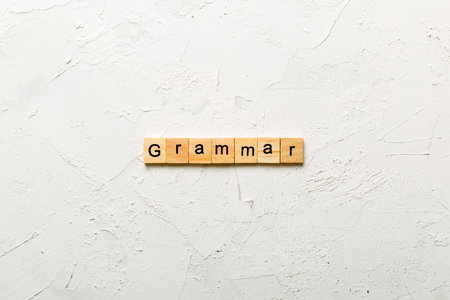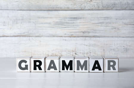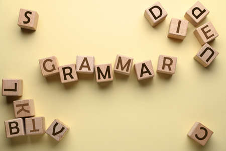 Text GRAMMAR made of cubes and different words on light background. Concept of studying English