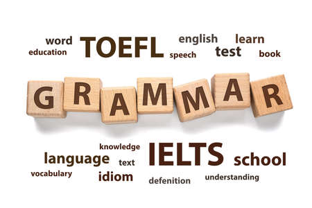 Text GRAMMAR made of wooden cubes and different words on white background. Concept of studying English