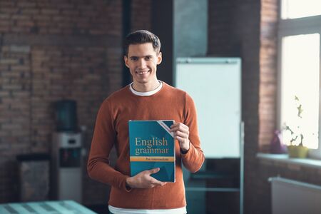 Student holding book. Handsome postgraduate smart student smiling while holding English grammar book
