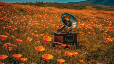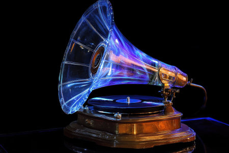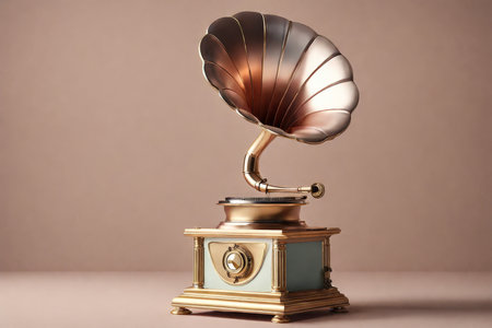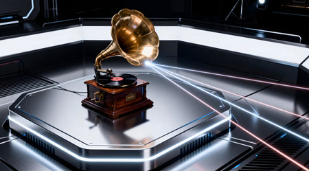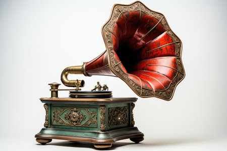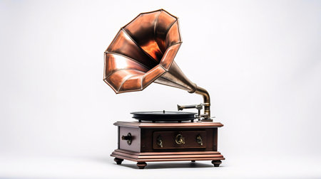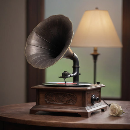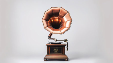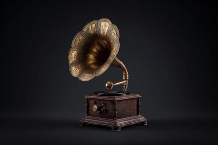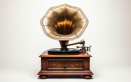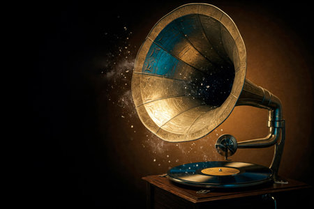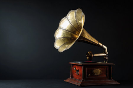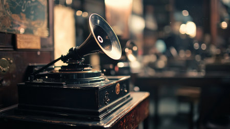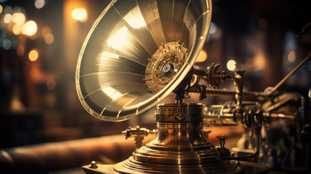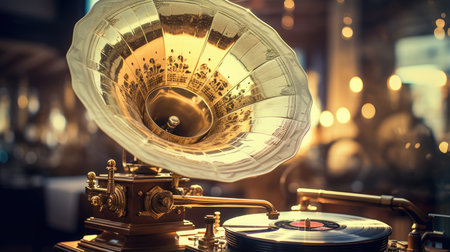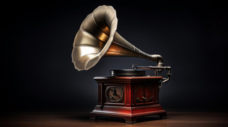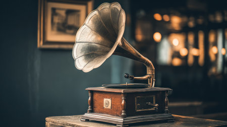 An antique gramophone is the focal point, showcasing a large metallic horn atop a wooden cabinet. The scene uses warm lighting, creating a nostalgic ambiance. The composition highlights the intricate details of the device. This image is suitable for various commercial purposes, including historical themes or vintage product illustrations.