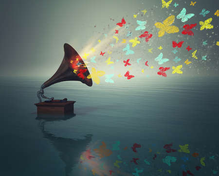 An antique gramophone stands in silhouette against a warm, vibrant sunset over the ocean, with a flock of birds soaring in the sky.