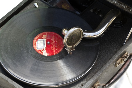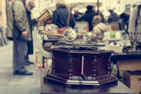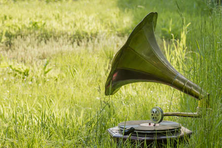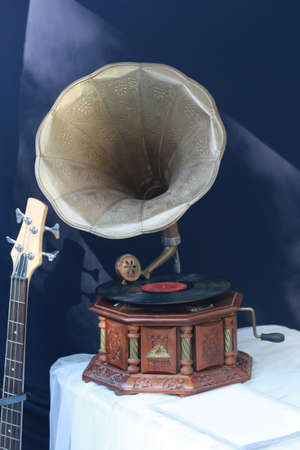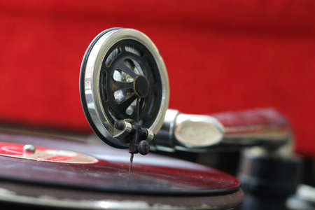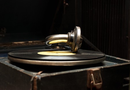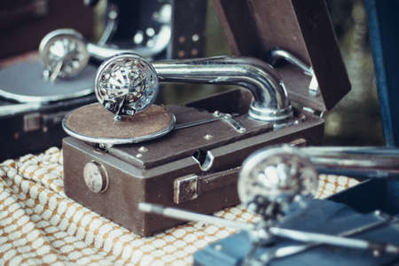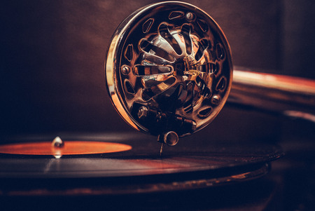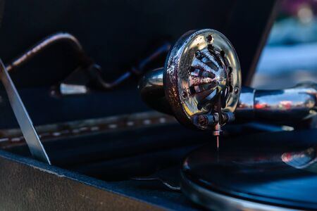Vintage gramophone close-up. Retro music background. Selective focus.