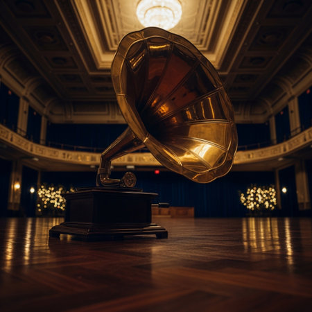A close-up of a vinyl record label spinning on a gramophone, with the brass horn reflecting warm light from a nearby lamp.