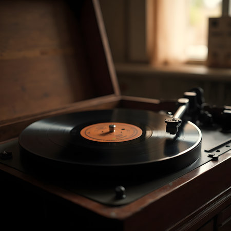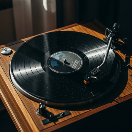 A vintage record player in use, with the tonearm gently resting on a spinning vinyl record, producing the iconic sound of analog music