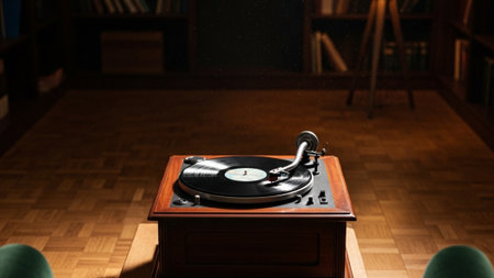 A vintage record player styled in warm ambient lighting, creating a nostalgic and elegant atmosphere.