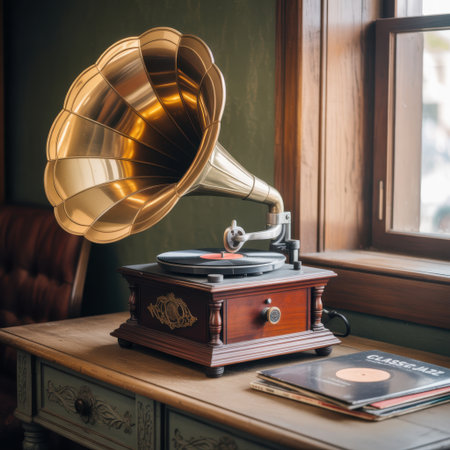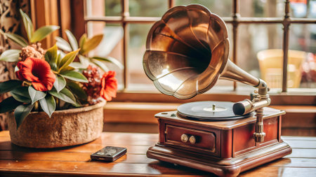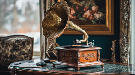 An antique gramophone is the central subject, resting on a wooden surface within a well-lit indoor space. The device showcases intricate detailing and a golden horn. The composition also includes a partially visible window and a framed artwork, evoking a sense of history. Suitable for illustrating nostalgia, or artistic projects.