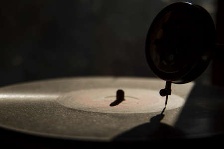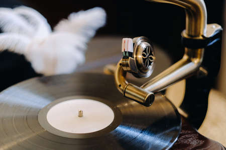 Macro view of the old style retro vintage music record player turntable with vinyl disc