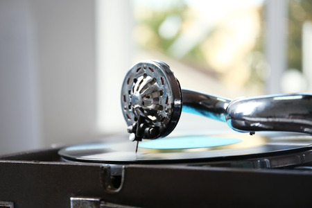 Vintage gramophone turntable vinyl record player close up, top view, toned