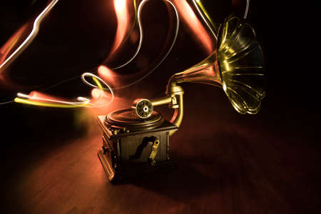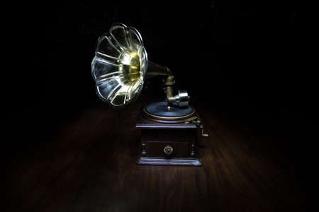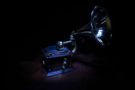 Music concept. Old gramophone on a dark background. Retro gramophone with disc on wooden table with toned backlight. Selective focus