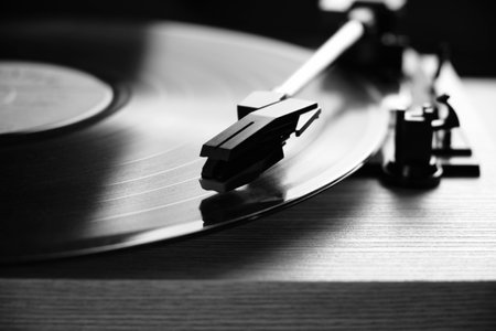 Black and white vinyl needle stylus on rotating black vinyl disk with copy space. Top view of vinyl record player.