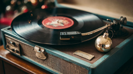 A vintage record player showcases intricate metal details while spinning a black vinyl disc in soft lighting.