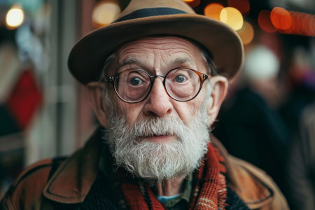 Closeup of an elderly man in glasses and a hat, looking thoughtful against a blurred city background